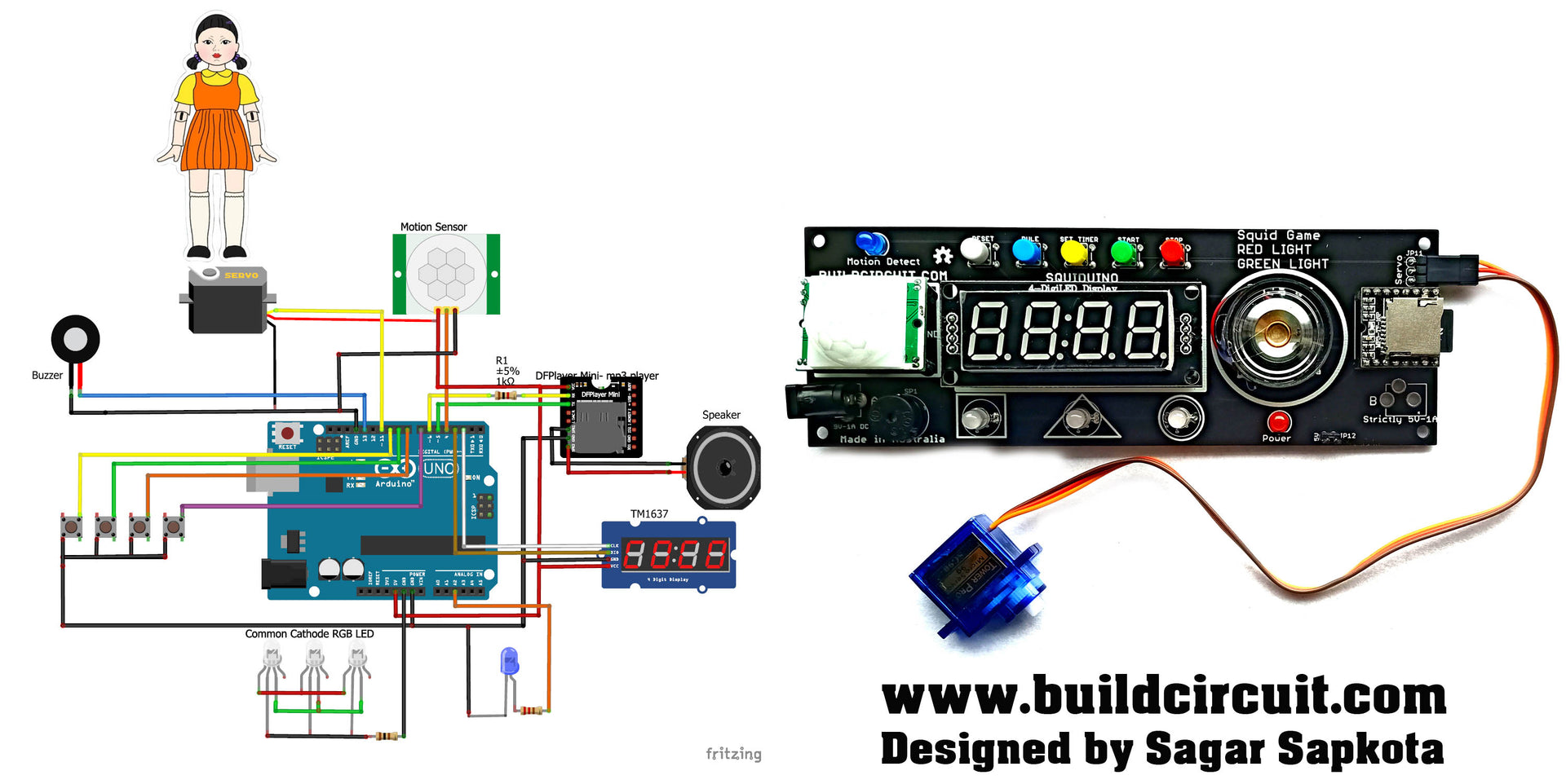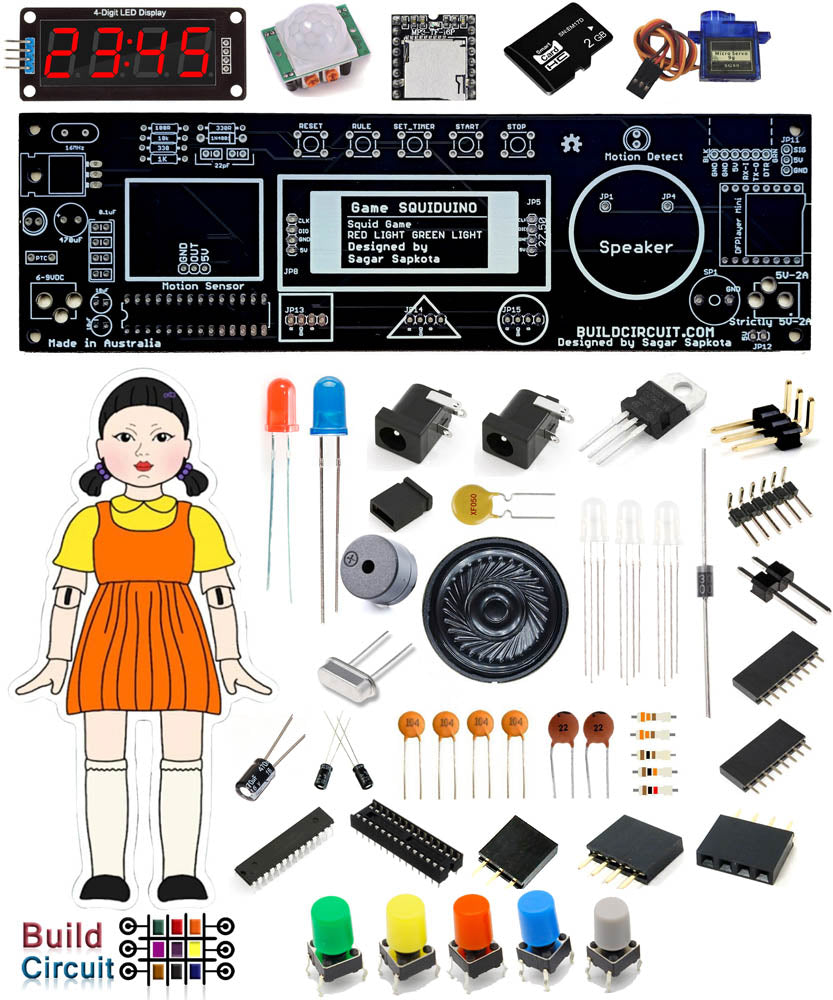 Resembles Netflix’s Squid Game’s ‘Red Light Green Light’ game. Set timer from 1:00 to 5:00 minutes Play rule of the game Comes with a motion sensor. It detects motion but cannot tell specifically which player moved. Comes fully assembled or as do-it-yourself(DIY) kit Comes with three RGB LEDs. Turns on RED when the device plays ‘RED LIGHT’ and turns on GREEN when the device plays ‘GREEN LIGHT’. There is a sticker of the scary doll that you can stick to a cardboard and glue it to the servo. Servo moves the sticker backward and forward. You can buy a doll separately and stick it to the servo. Play with friends and family to get the feel of ‘Squid Game Red Light Green Light’