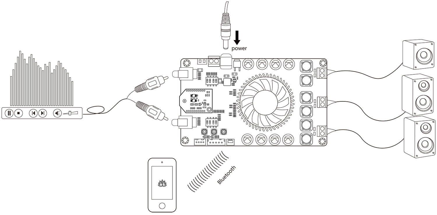 All the channels are capable of outputting nominal power simultaneously and continuously. This board can be powered by any DC 12V-30V power supply. It can be used to drive any 4Ω or 8Ω passive speakers.