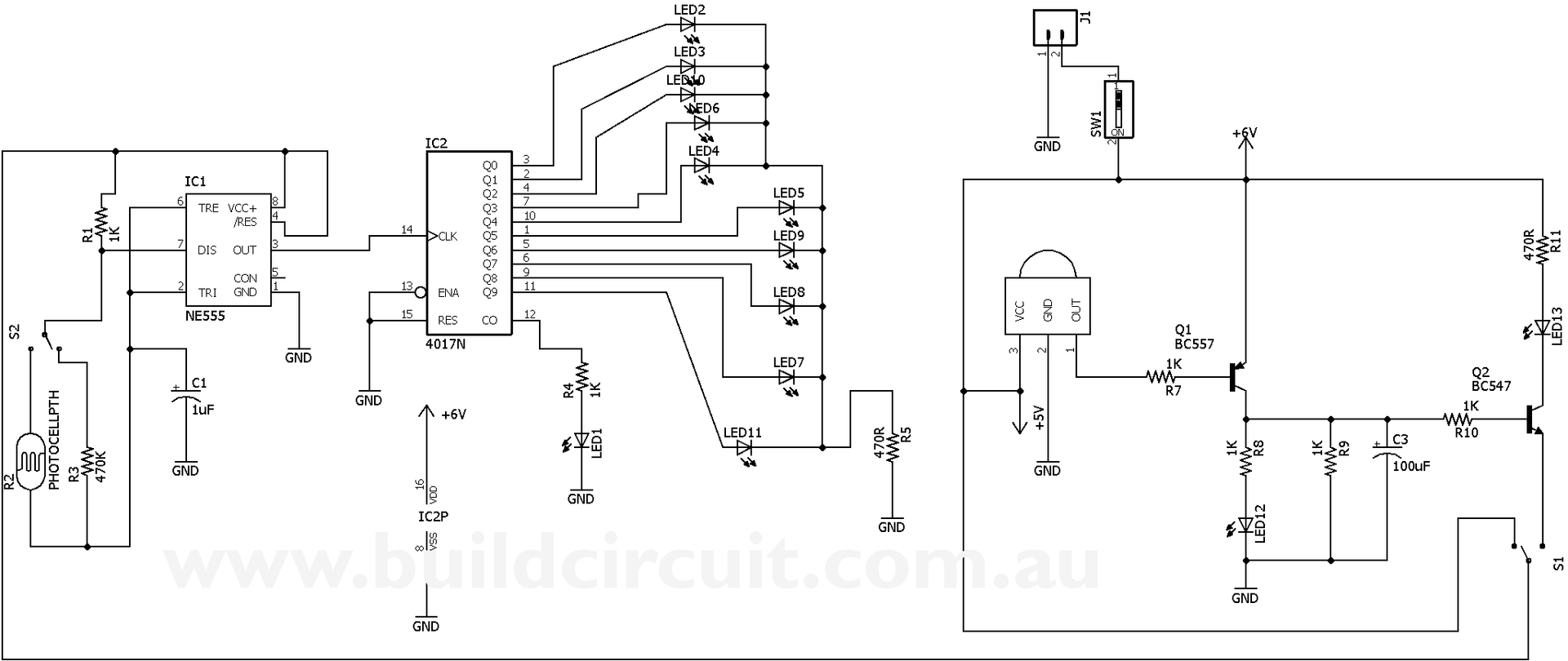 LED chaser using NE555, CD4017, Infrared receiver and photoresistor